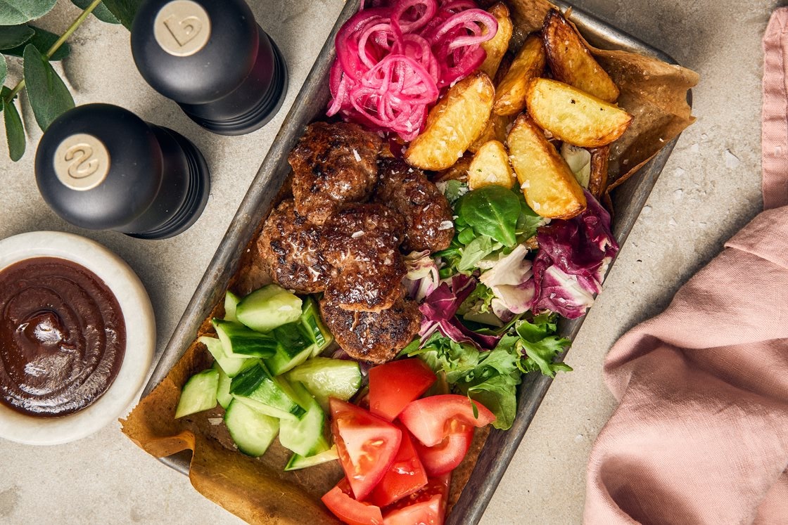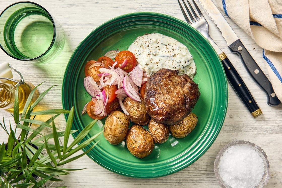Nötfärsbiffar med rosmarin, tzatziki och rostad potatis
