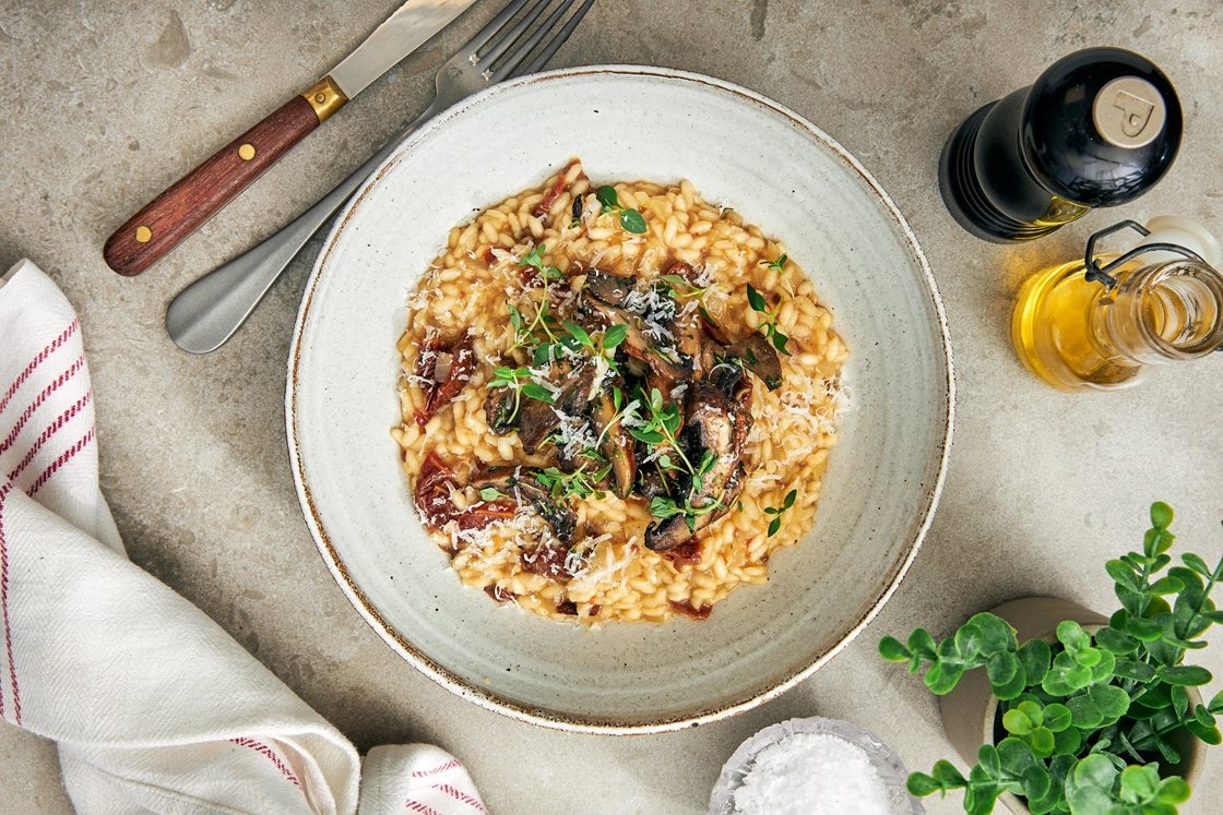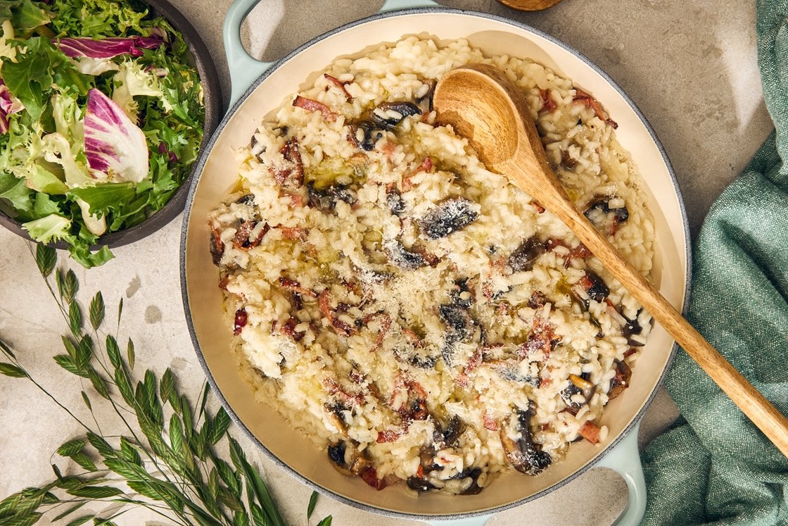 Italiensk svamprisotto med kalkonbacon, parmesan och mixsallad