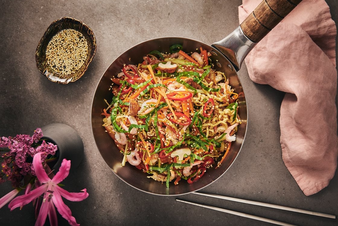 Japchae - sojamarinerade nudlar med grönsaker räkor och sesamfrön