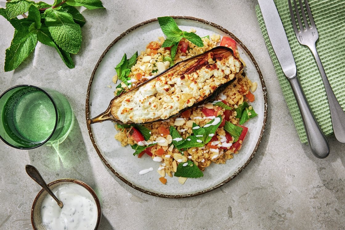 Bakad fetaaubergine med bulgursallad och myntayoghurt