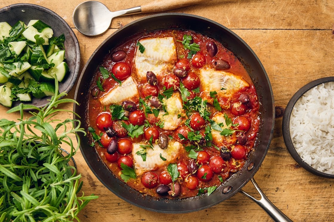 Medelhavspanna med kolja, kalamataoliver, citron och persilja