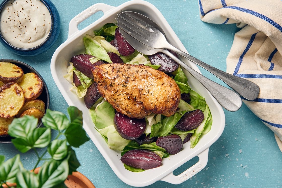 Timjan- och vitlöksstekt kyckling med tryffelyoghurt, ugnsbakade rödbetor och spetskål