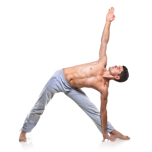 Rikta armarna rakt fram respektive bak i axelhöjd och låt sedan högra armen sträckas framåt samtidigt som överkroppen följer med en bit. På en utandning fäll överkroppen ned rakt över höger ben och vila högerhanden någonstans på höger ben. Undvik dock knät. Sträck vänster arm rakt upp mot taket.