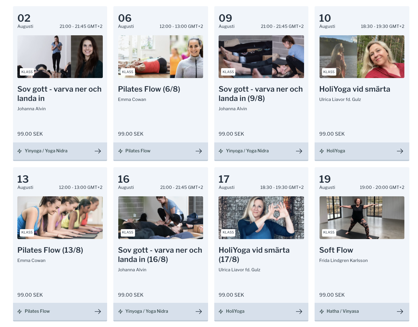 Styrka och rörlighet, smärtlindring eller skön avslappning – vad behöver du? Spana in augusti månads LIVE-kalender här!