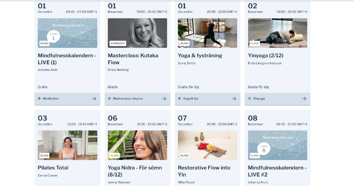 Klasser kopplade till Mindfulnesskalendern, med syftet att hjälpa dig möta julen med lite mer lugn.- 1 december: Utforska närvaro och uppmärksamhet i kroppen, andetaget, sinnena, tankarna och omgivningen.
