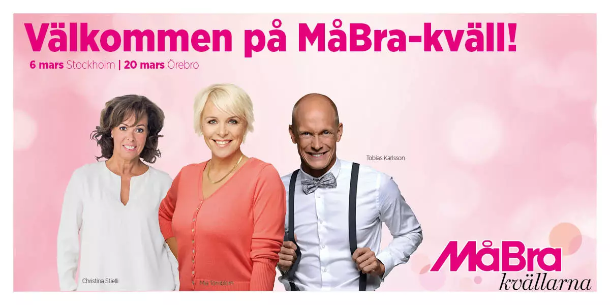 Välkommen på en helkväll tillsammans med MåBra och tre av Sveriges bästa föreläsare! Kvällen inleds med mingel och shopping innan programmet på scen tar vid. Kvällens underhållning är drömtrion Mia Törnblom, Christina Stielli och Tobias Karlssonsom målande berättar om generositet, drömmar och vägval i livet. Vi utlovar både skratt och gråt! Under kvällen bjuds det även på härlig mat och dryck samt möjlighet att prata med både MåBras redaktion och våra inspirerande föreläsare. Varmt välkomna!
