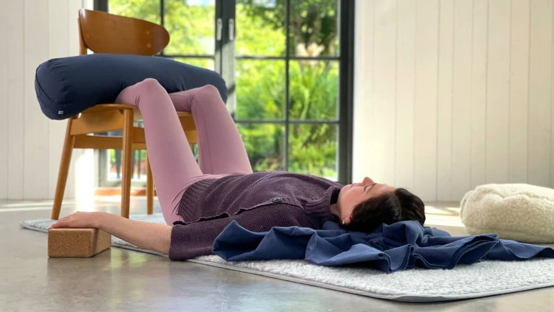 För att skapa stöttning till kroppen kommer du behöver ha en stol, pall eller soffa att lägga upp benen på i slutet av klassen. Utöver det kommer du ha användning för två filtar och två bolster/kuddar, samt två block, eller tjockare böcker.