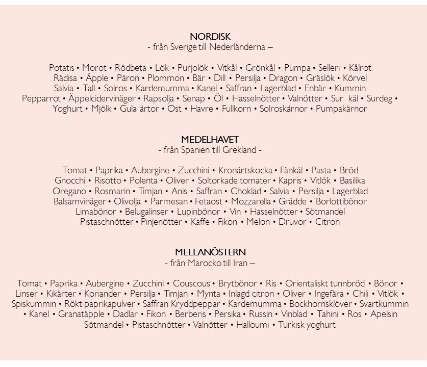 I olika delar av världen har vissa smaker kombinerats i århundraden eftersom de är såååååå goda tillsammans. Dessa klassiska kombinationer är riktigt roliga att leka med. Du hittar tre exempelgrupper i illustrationen nedan för att få inspiration. Såklart finns det även en nordisk smakgrupp, för att hålla i midsommarandan.