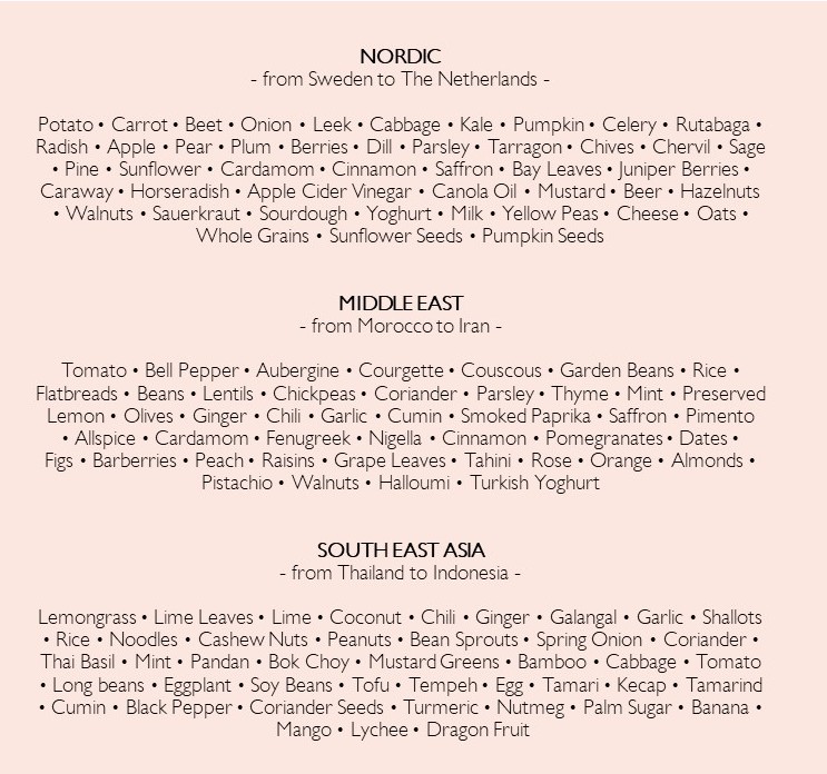In different parts of the world, certain flavors have been combined for centuries because they are soooooo good together. These classic combinations are really fun to play with. You find three example groups in the illustration, to get an idea. Including of course a Nordic flavor group, to stay in the spirit of midsummer.