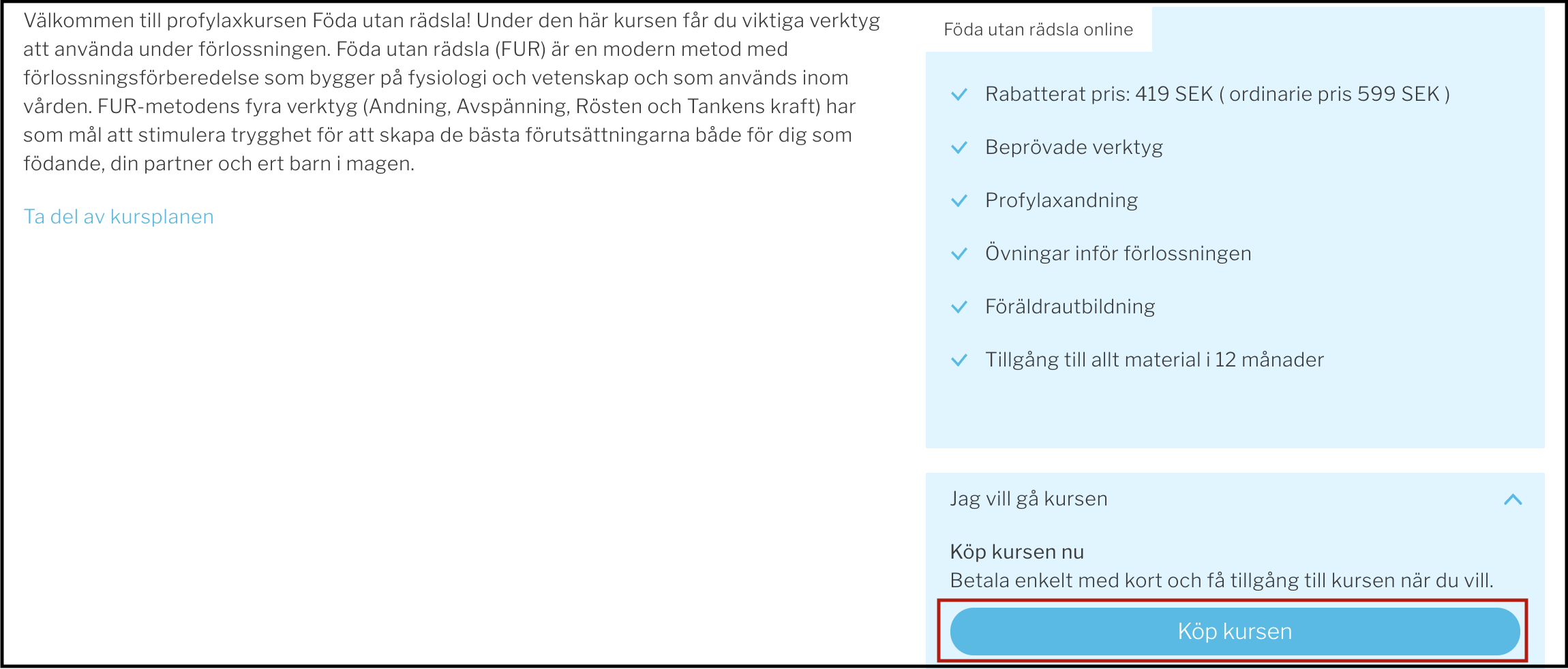 Sidan kommer att uppdateras och du ser nu det rabatterade priset. Scrolla ner lite och klicka på "Jag vill gå kursen" och därefter på "Köp kursen".