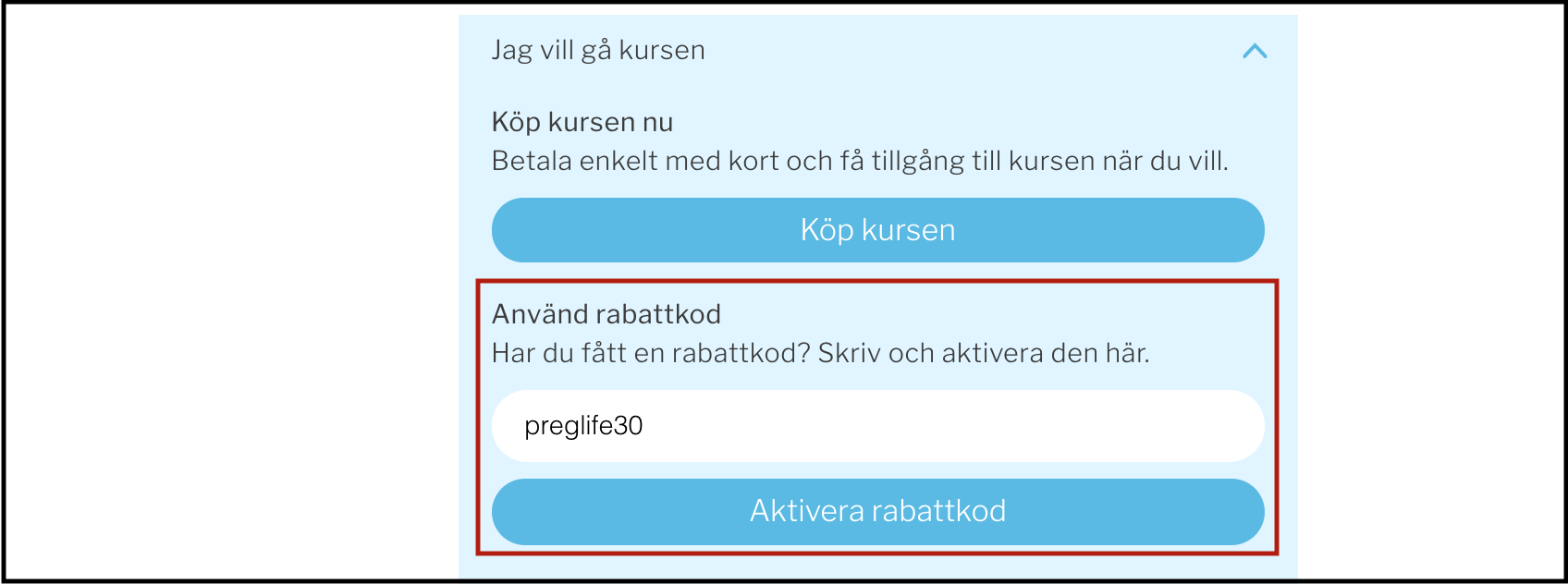 På kurssidan för den kurs du vill köpa, klicka på "Jag vill gå kursen" och fyll i rabattkoden preglife30 under "Använd rabattkod". Klicka på "Aktivera rabattkod".