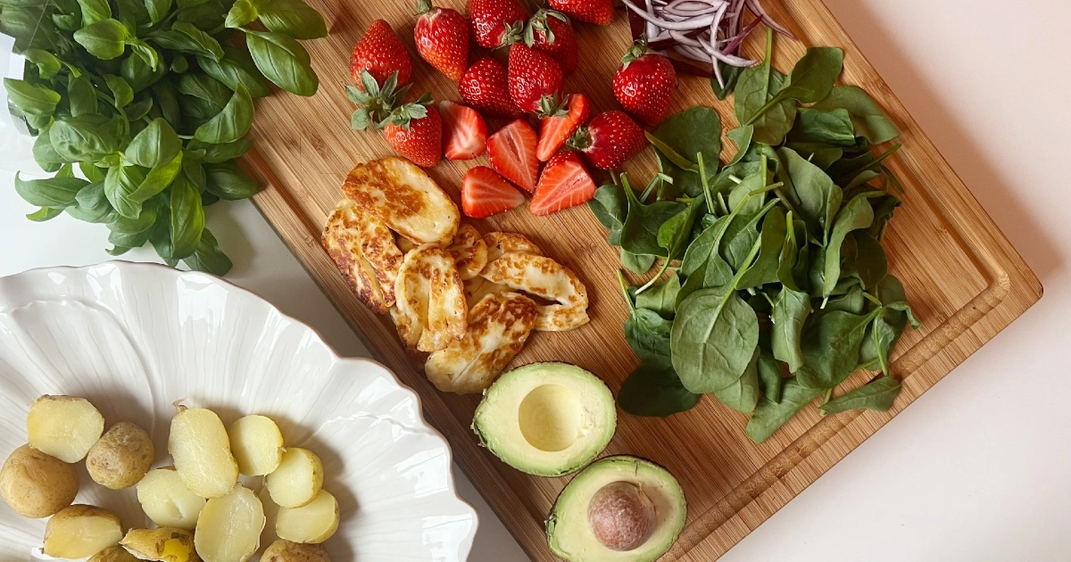 Fira midsommar med ett fräscht och näringsrikt alternativ till den klassiska sillbuffén! Den här salladen kombinerar sommarens bästa smaker – färskpotatis, jordgubbar och örter – med hälsosamma fetter från avokado, protein från halloumi och serveras med en smakrik dijondressing.