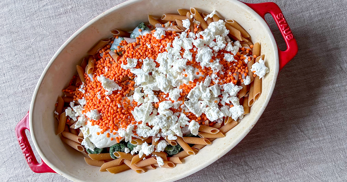 Vegetarisk pasta med linser, spenat & fetaost – enkelt och gott!