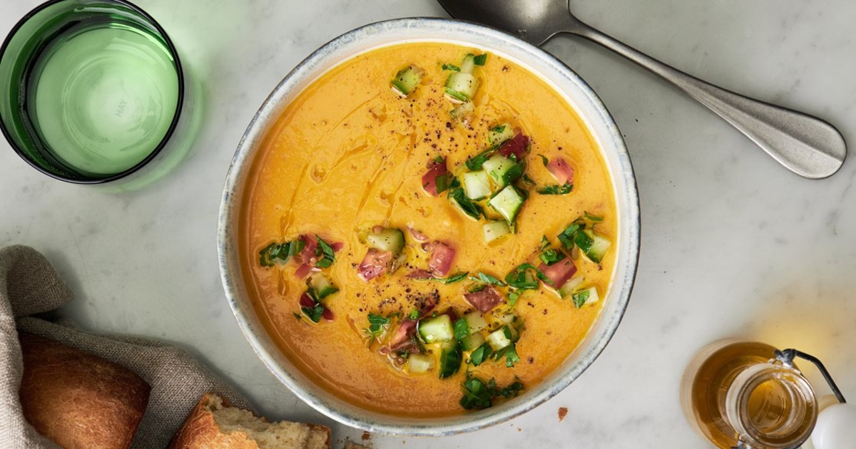 - Toppa morotssoppan med gurka, tomat, persilja och lite chili flakes. Servera med det nygräddade brödet.