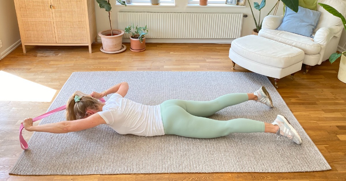 Välj ett tunnare band för denna övning. Lägg dig på mage. Håll i motståndsbandet med båda händerna, rakt framför huvudet. Låt högerarmen dra bandet nedåt medan du stoppar ner skulderbladet i byxfickan samtidigt som du låter vänsterarmen vara kvar i samma position. Byt sida.