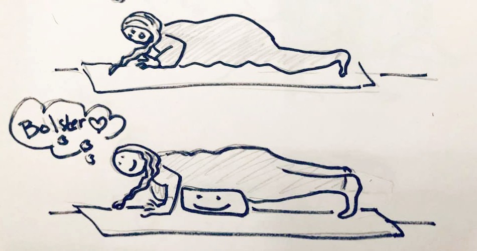 4. Chaturanga Dandasana – svårt att ha raka ben när allt annat hamnar i mattan. Armarna kämpar för att hålla upp kroppen. Testa det här (du behöver ett bolster): Lägg ett bolster under kroppen och du kan känna på posen. Ta-da!