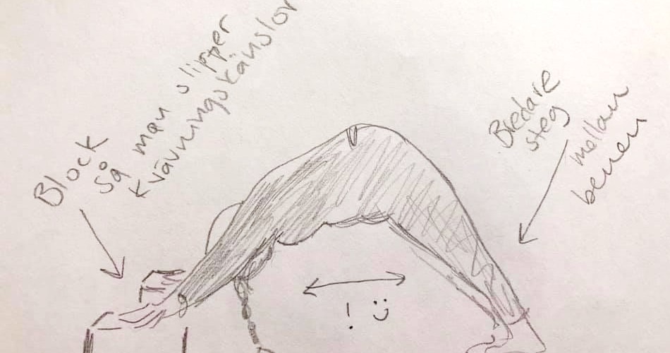 - Skulderstående: Vik ihop 1-2 filtar och lägg under ryggen. Ta ett block (eller 2) och sätt i korsryggen. Slappna av i axlarna. Armarna lätt ut åt sidan. Benen strävar uppåt. Om det frestar på att ha benen i luften, kryp nära en vägg.