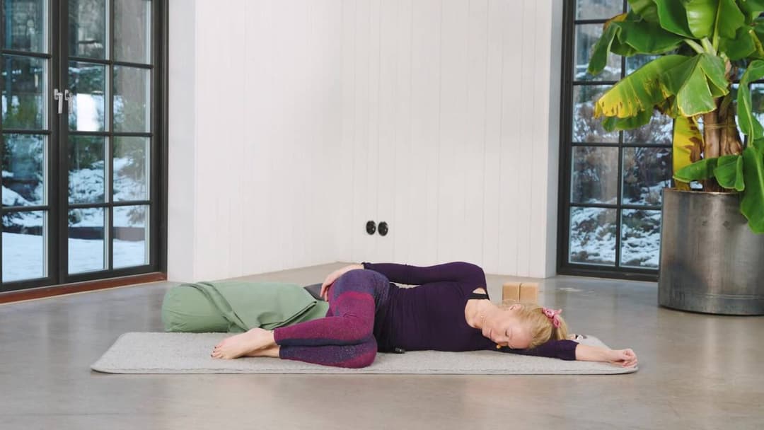 Släpp spänningar i höft och ländrygg samt varva ner genom lugna, ryggliggande positioner.